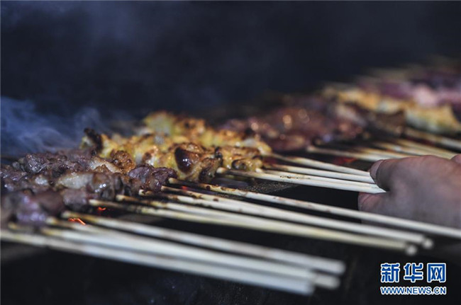 在新疆喀什市歐爾達(dá)路的夜市上,一名燒烤攤販在烤制肉串(8月12日攝)。新華社記者 王菲 攝
