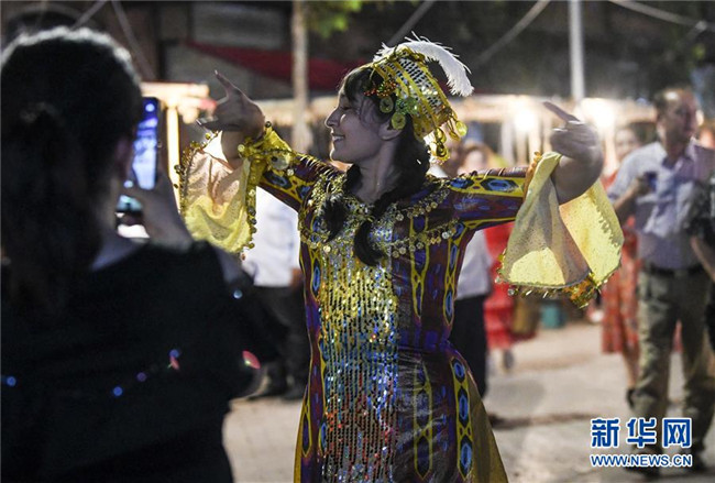 在新疆喀什市歐爾達(dá)路的夜市上,一名身穿民族服飾的姑娘邊跳舞邊錄制視頻(8月12日攝)。新華社記者 王菲 攝