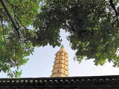 北塔是一座方形九層十一級樓閣式磚塔,海寶塔建筑風格獨特,方形的塔身,四面的券門,眾多的棱角,四角的尖頂,為中國古塔所罕見,被視為中國古代建筑的杰作。