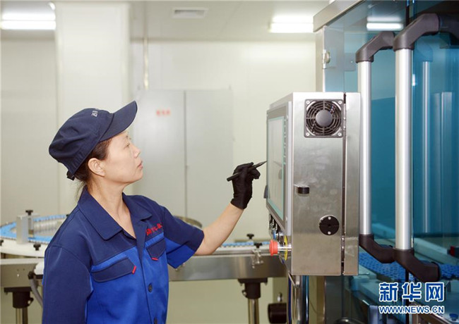 吉林敖東藥業(yè)集團延吉股份有限公司燈檢線操作工朱秀芳在操作全自動凍干粉針偵檢機(8月22日攝)。新華社發(fā)