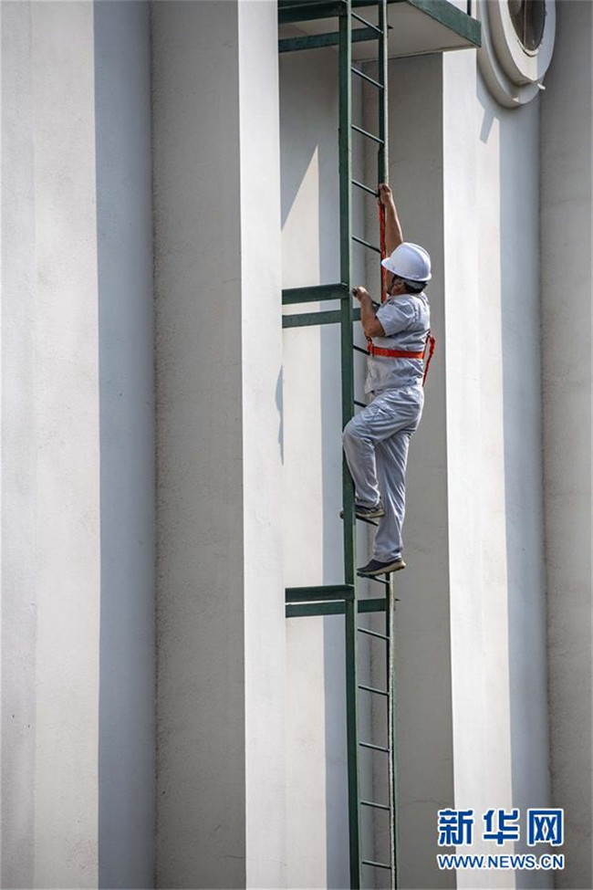 8月26日,中儲糧襄陽直屬庫的一名職工在查看倉房外墻情況。