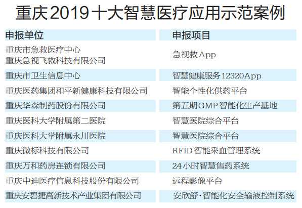 8月28日,在2019智博會(huì)上,重慶日?qǐng)?bào)、上游新聞聯(lián)合發(fā)布了重慶2019十大智慧醫(yī)療應(yīng)用示范案例,重慶市急救醫(yī)療中心、重慶市衛(wèi)生信息中心、重慶華森制藥等單位申報(bào)項(xiàng)目入選十大案例。