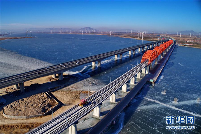 中鐵三局工人在河北張家口京張高鐵官廳水庫特大橋進行鋪軌作業(yè)(1月13日無人機拍攝)。新華社記者 楊世堯 攝