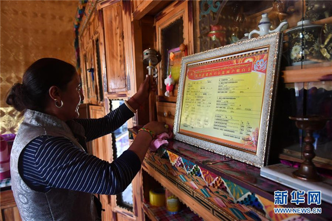 在青海省玉樹藏族自治州治多縣治渠鄉(xiāng)同卡村,村民昂文西讓的妻子布沙措江卓瑪清理家里的柜子(9月12日攝)。新華社記者孫瑞博攝