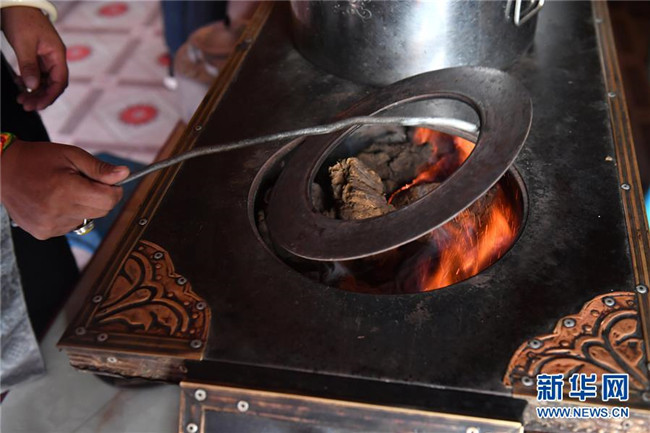 在青海省玉樹藏族自治州治多縣治渠鄉(xiāng)同卡村,村民布沙措江卓瑪給家中的爐子添加燃料——牛糞(9月12日攝)。在當(dāng)?shù)?,清潔環(huán)保的牛糞依然是不少牧民選用的主要燃料。新華社記者孫瑞博攝