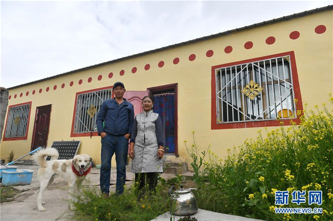 在青海省玉樹藏族自治州治多縣治渠鄉(xiāng)同卡村,村民昂文西讓和妻子布沙措江卓瑪站在易地搬遷的新家院子里合影(9月12日攝)。新華社記者孫瑞博攝
