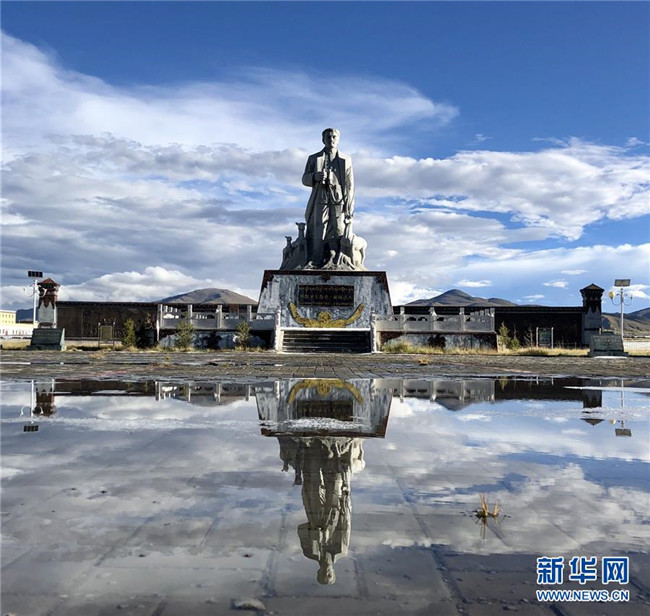 這是在青海省玉樹藏族自治州治多縣用手機(jī)拍攝的“環(huán)保衛(wèi)士”杰桑·索南達(dá)杰的雕像(9月12日攝)。新華社記者鄒樂攝