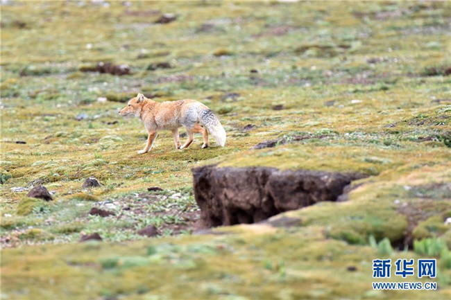 在青海省玉樹藏族自治州治多縣,一只藏狐雨后“漫步”在草場上(9月12日攝)。新華社記者孫瑞博攝