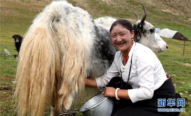 在青海省玉樹藏族自治州治多縣治渠鄉(xiāng)同卡村,村民昂文西讓的妻子布沙措江卓瑪正在擠牛奶(9月12日攝)。新華社記者韓方方攝