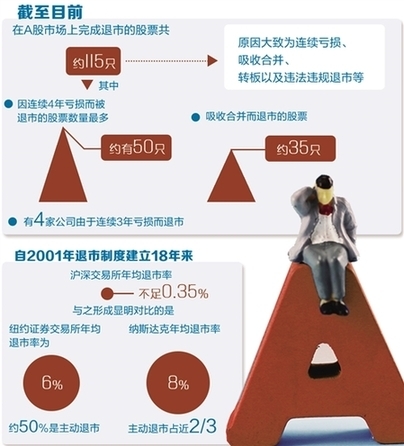 自2001年退市制度建立18年來(lái),滬深交易所年均退市率依舊不足0.35%,主動(dòng)退市更是少之又少,遠(yuǎn)不能保障A股進(jìn)出平衡。與之形成鮮明對(duì)比的是,紐約證券交易所年均退市率為6%,約50%是主動(dòng)退市;納斯達(dá)克年均退市率8%,主動(dòng)退市占近2/3,而A股市場(chǎng)則大多是被動(dòng)退市,極少有主動(dòng)退市的情況。