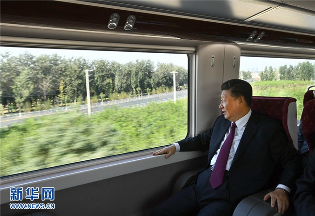 9月25日上午,北京大興國(guó)際機(jī)場(chǎng)投運(yùn)儀式在北京舉行。中共中央總書記、國(guó)家主席、中央軍委主席習(xí)近平出席儀式,宣布機(jī)場(chǎng)正式投運(yùn)并巡覽航站樓。這是習(xí)近平乘坐軌道列車前往北京大興國(guó)際機(jī)場(chǎng)。 新華社記者 謝環(huán)馳 攝