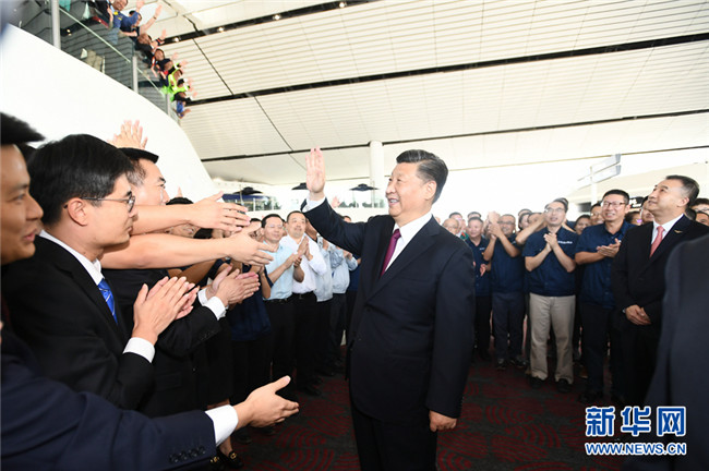 投運(yùn)儀式在機(jī)場(chǎng)聯(lián)檢大廳舉行。11時(shí)許,伴隨著歡快的迎賓曲,習(xí)近平等步入儀式現(xiàn)場(chǎng),全場(chǎng)起立鼓掌。