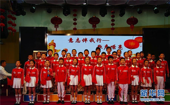 9月26日,北京市建華實驗學校的小學生在活動中合唱紅色歌曲。