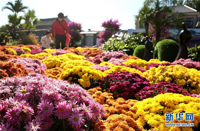 10月8日,在大廠回族自治縣小廠村,游客在欣賞菊花。新華社記者 王曉 攝