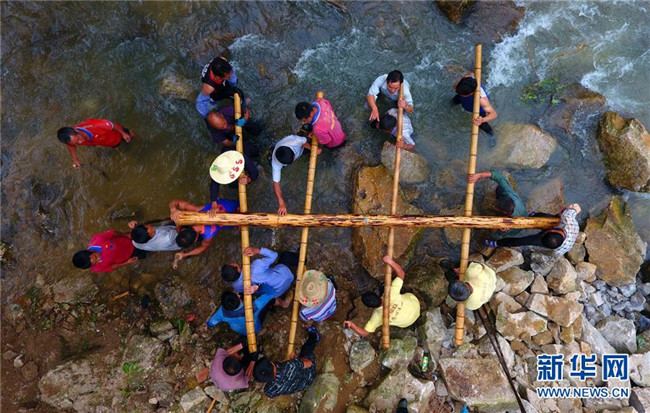 群眾在黔桂烏英苗寨蘆笙坪施工現(xiàn)場(chǎng)勞動(dòng)(7月27日無(wú)人機(jī)拍攝)。
