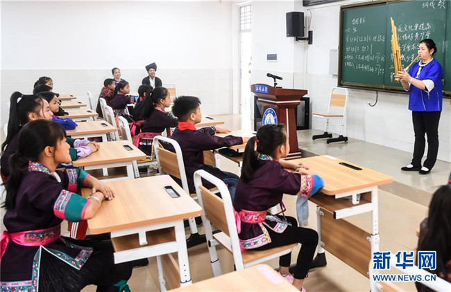 這是廣西三江侗族自治縣民間藝人在教江川小學(xué)學(xué)生吹奏蘆笙(10月14日攝)。新華社記者張愛林?jǐn)z