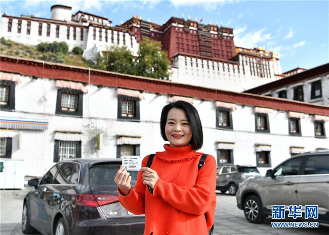 10月15日,從西寧來的游客張書培展示她用身份證換取的布達(dá)拉宮散客免費(fèi)預(yù)約券。