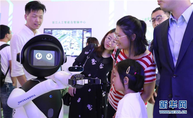 參觀者在上海舉行的2019世界人工智能大會上與一個智能機器人進行交流(8月29日攝)。新華社記者 方喆攝