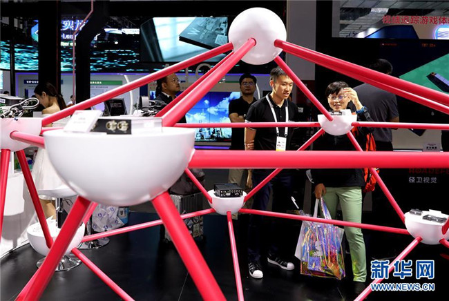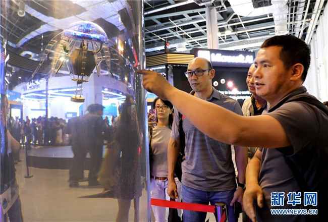 一名參觀者(中)在上海舉行的2019世界人工智能大會上體驗一款采用混合現(xiàn)實技術的智能眼鏡(8月29日攝)。新華社記者 方喆攝