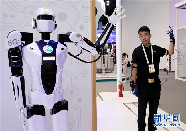 一名工作人員(右)在上海舉行的2019世界人工智能大會上演示一款基于5G網(wǎng)絡實現(xiàn)遠程控制的機器人(8月29日攝)。新華社記者 方喆攝