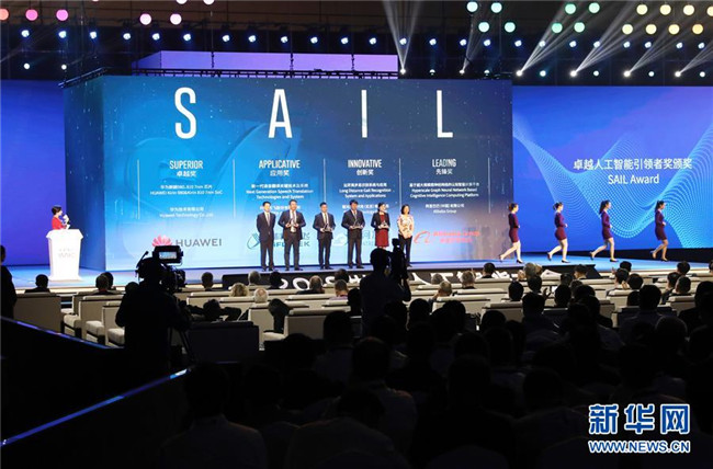 在上海舉行的2019世界人工智能大會開幕式上,獲得卓越人工智能引領者獎的企業(yè)代表合影(8月29日攝)。新華社記者 方喆攝