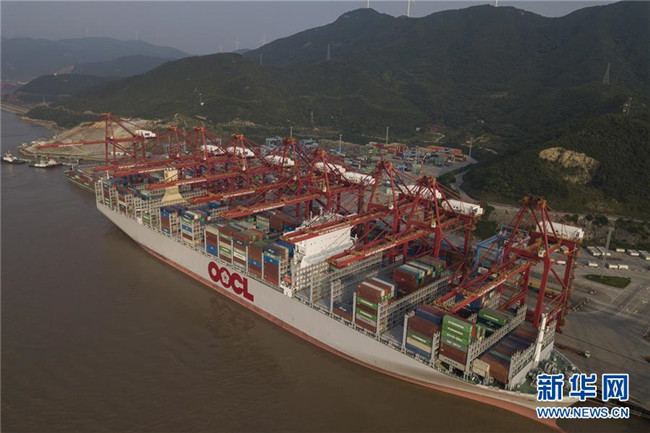 一艘貨輪停靠在寧波舟山港穿山港區(qū)集裝箱碼頭(2018年6月13日無人機拍攝)。新華社記者 黃宗治 攝