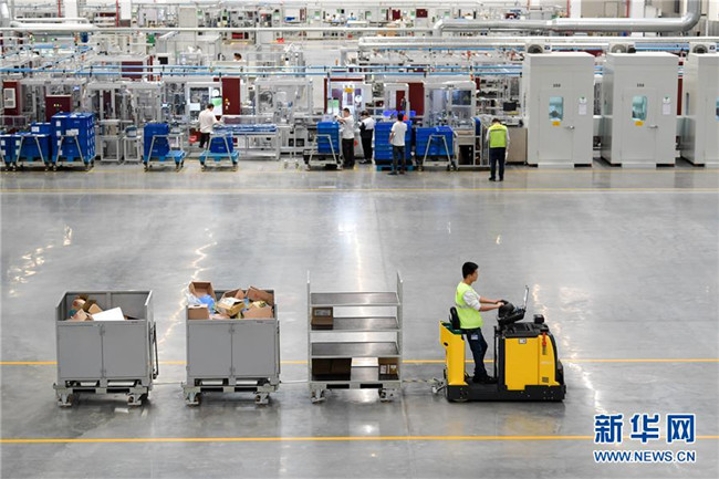 江蘇太倉博澤汽車部件有限公司工作人員在生產(chǎn)車間運輸產(chǎn)品(10月30日攝)。新華社記者 李博 攝