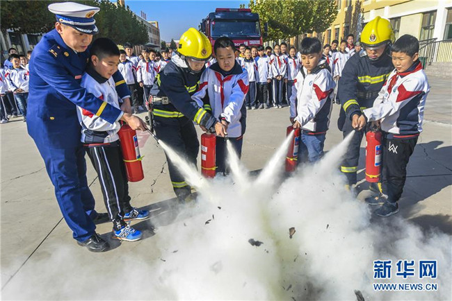 11月8日,消防員在河北省大廠回族自治縣城關小學指導學生們使用消防設備。 新華社記者李曉果攝