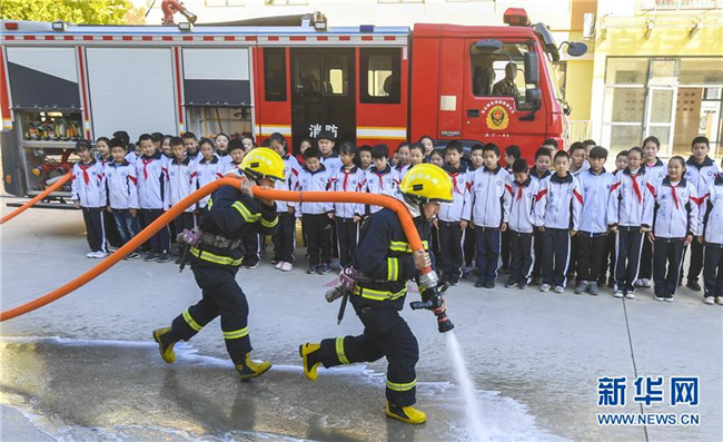 11月8日,消防員在河北省大廠回族自治縣城關小學向學生們展示消防設備的使用方法。新華社記者李曉果攝