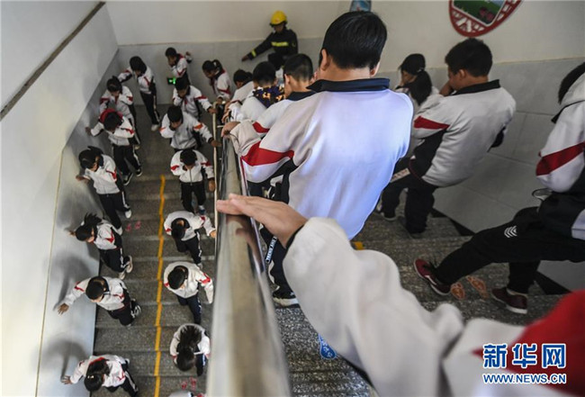 11月8日,河北省大廠回族自治縣城關小學的學生們在校園內參加模擬逃生演練。新華社記者李曉果攝