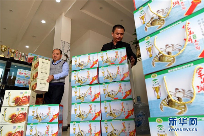 在江西省進(jìn)賢縣軍山湖大閘蟹線上銷(xiāo)售網(wǎng)點(diǎn),工作人員準(zhǔn)備將裝箱的大閘蟹發(fā)貨給網(wǎng)購(gòu)的顧客(2018年11月9日攝)。新華社記者 彭昭之 攝