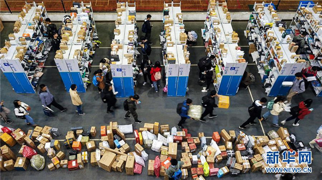 南京航空航天大學(xué)師生在校園臨時(shí)快遞取件點(diǎn)領(lǐng)取快遞(2018年11月13日攝)。為應(yīng)對(duì)“雙十一”大量校園快遞包裹,南京航空航天大學(xué)在原“快遞超市”的基礎(chǔ)上,將學(xué)校體育中心室內(nèi)網(wǎng)球場(chǎng)搭建為臨時(shí)快遞取件點(diǎn),方便在校師生取件。新華社記者 李博 攝