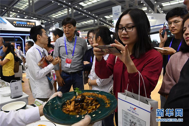 觀眾在第21屆高交會(huì)上拍攝一款炒菜機(jī)器人做出的菜品(11月13日攝)。 新華社記者 梁旭 攝