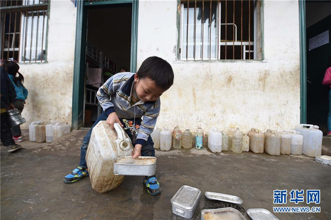 在廣西大化瑤族自治縣板升鄉(xiāng)八好小學(xué),一名學(xué)生喝水桶里的雨水(2014年11月24日攝)。八好小學(xué)有400多名學(xué)生,曾僅有一個不足100立方米的水柜,用于收集儲存樓頂?shù)挠晁?,學(xué)生需定期定量用水。遇到長時間不下雨,學(xué)校需要到鄉(xiāng)政府所在地運水。如今,學(xué)校修建了5個大水柜,并從兩公里外引泉水到校園,飲水難問題得到解決。 新華社記者 黃孝邦 攝