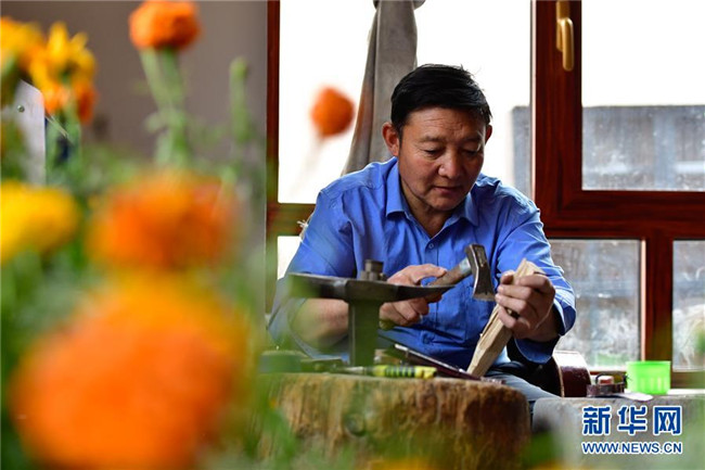 11月17日,芒擦藏刀匠人更求彭措在制作藏刀裝飾品。新華社記者 張龍 攝