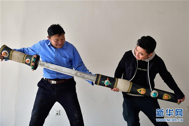 11月17日,芒擦藏刀匠人更求彭措(左)與外甥才仁戰(zhàn)斗將一把大型藏刀裝入刀鞘中。新華社記者 張龍 攝