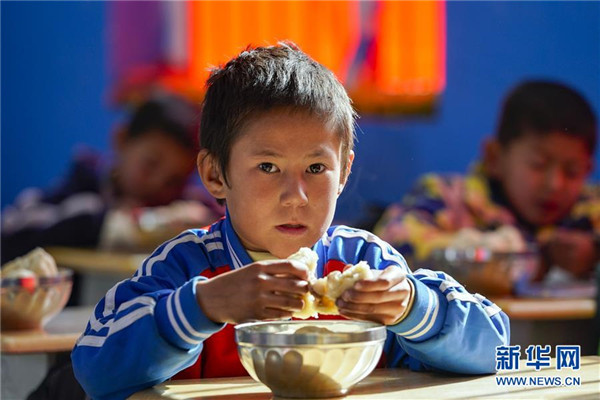 11月19日,在新疆于田縣達里雅布依鄉(xiāng)易地扶貧搬遷安置點的新學(xué)校,一年級學(xué)生在學(xué)校里吃免費午餐。新華社記者沈伯韓攝