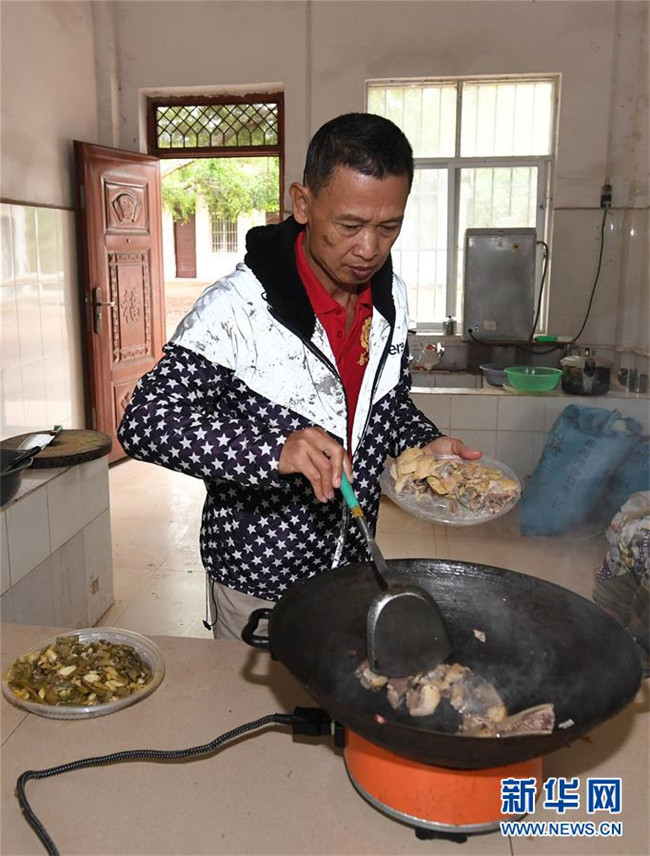 11月19日,在廣西上思縣那琴鄉(xiāng)中心小學逢通村教學點,梁志雄在給學生做午飯。新華社記者陸波岸攝