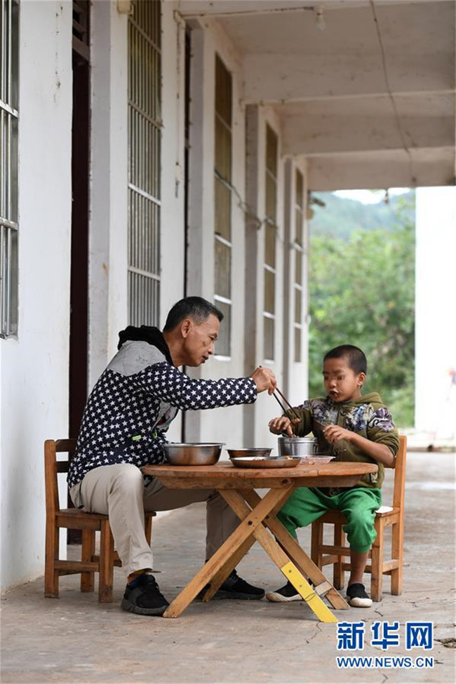 11月19日,在廣西上思縣那琴鄉(xiāng)中心小學逢通村教學點,梁志雄和一名學生吃午飯。新華社記者陸波岸攝