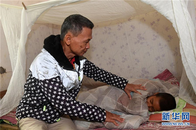 11月19日,在廣西上思縣那琴鄉(xiāng)中心小學逢通村教學點,梁志雄在照顧一名學生午休。新華社記者陸波岸攝