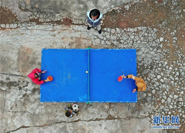 11月19日,在廣西上思縣那琴鄉(xiāng)中心小學逢通村教學點,梁志雄教學生打乒乓球(無人機拍攝)。新華社記者陸波岸攝