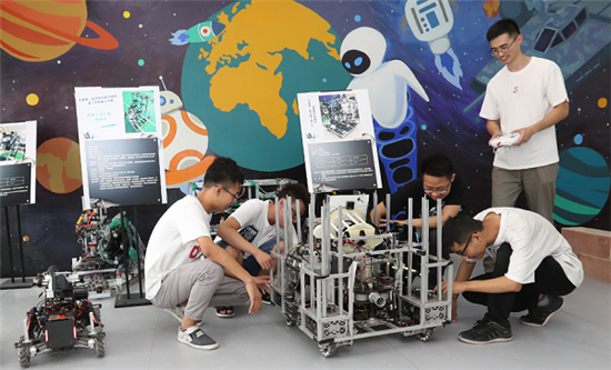 四川大學智能感知與先進控制創(chuàng)新工坊中,團隊帶頭人吳文強正在為同學們演示操作工程車機器人。 張勁松攝