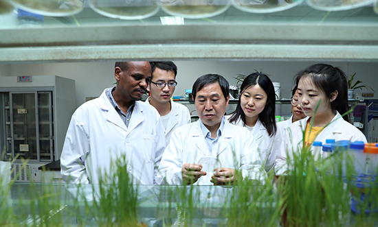 西北農(nóng)林科技大學旱區(qū)作物逆境生物學國家重點實驗室小麥-條銹菌互作室里,“小麥癌癥”攻克者康振生院士正指導學生觀察酵母菌落培養(yǎng)情況。張勁松攝