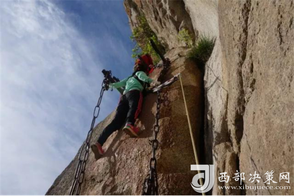 長空棧道:“長空棧道”可謂華山險道之首,它尤如一道奇異的仙練鑲嵌在南峰絕壁。明代“后七子”之一的李攀龍《太華山記》載:“出南天門向西就是棧道,棧雖有銅柱鐵索攔護(hù),然闊不盈尺。行二十余丈方至盡頭。下折為井,高約三丈,旁出復(fù)為棧……”置身其中,直覺背空腳虛,發(fā)豎氣閉,寒風(fēng)沖襠,骨松筋緊,膽大者有凌空欲飛之感,膽弱者心生抵近鬼門之憂。多少年來“長空棧道”以它特有的絕險情懷召喚著天下英雄豪杰一試身手,體驗驚心動魄,揮灑豪邁人生。