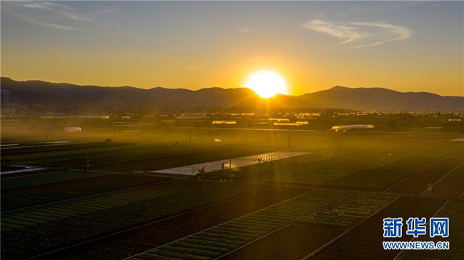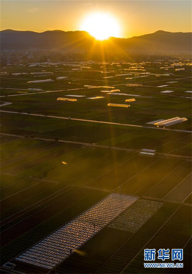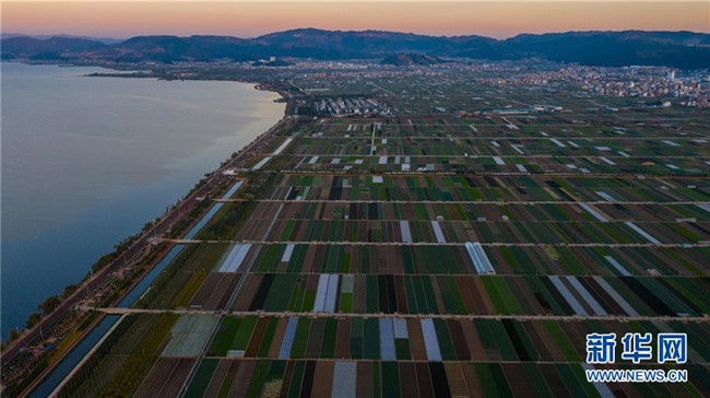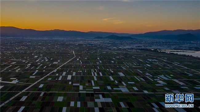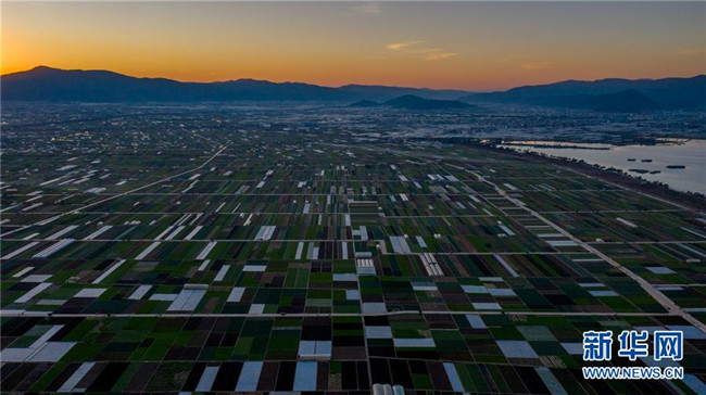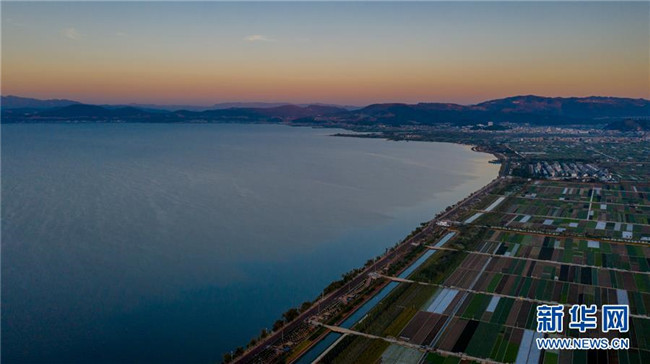 這是云南省玉溪市通??h的田園風(fēng)光(11月23日無人機(jī)拍攝)。初冬時(shí)節(jié),云南省玉溪市通海縣風(fēng)景秀麗,山巒、湖水與農(nóng)田組成了一幅美麗的田園詩畫卷。新華社記者胡超攝