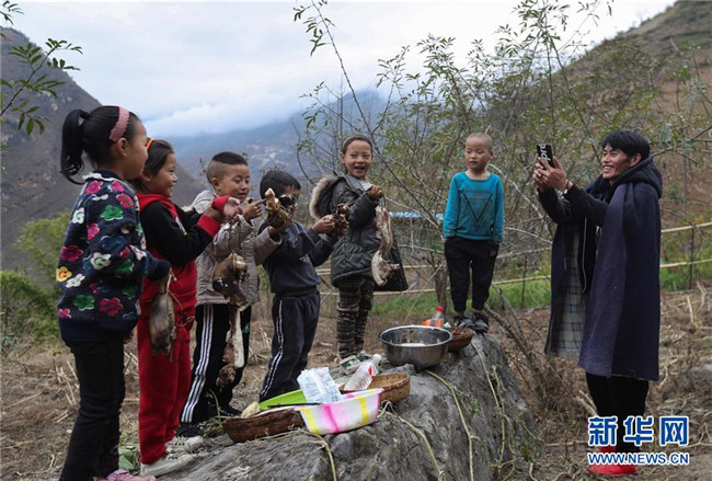 11月24日,在昭覺縣支爾莫鄉(xiāng)阿土列爾村,村民阿牛用手機(jī)拍攝孩子們向大家拜年的視頻。