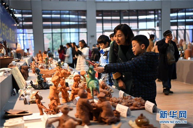 12月1日,一對(duì)母子在陶藝技能大賽現(xiàn)場(chǎng)參觀參賽作品。新華社記者唐奕攝