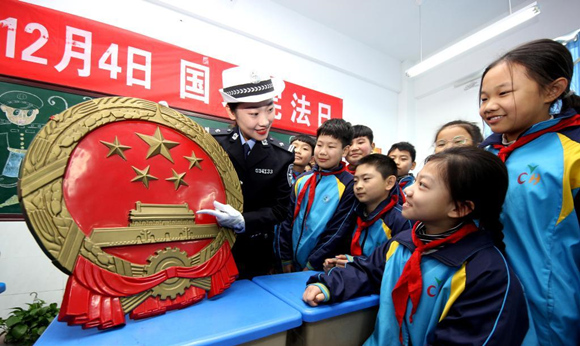 2019年12月3日,在第六個“國家憲法日”到來之際,山東省棗莊市公安局嶧城分局交警大隊一名交警在荀子小學為學生們普及憲法知識。吉喆 攝(人民圖片)