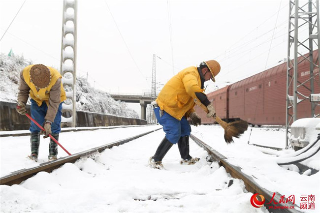 12月5日,云南省滇東北迎來今年以來首場降雪。昆鐵曲靖工務(wù)段及時啟動大雪天氣應(yīng)急預(yù)案,成立除雪打冰隊,加強道岔除雪除冰工作。攝影:楊永全