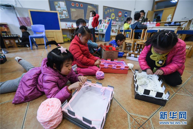 12月11日,小朋友用紙盒制作的工具編織愛心圍巾。 新華社記者 徐昱 攝
